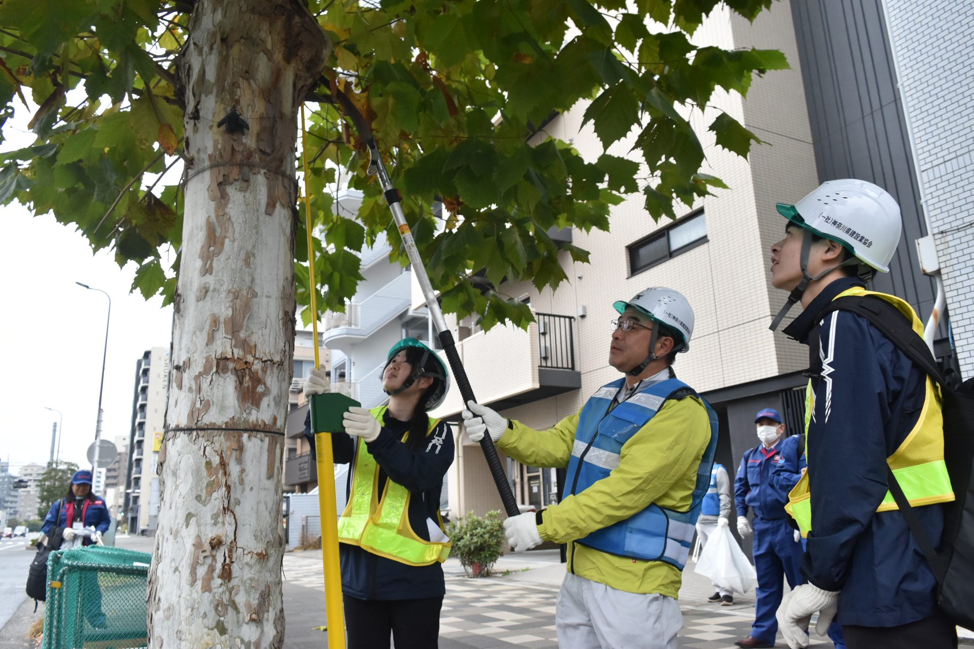 沿道の木の高さを測り、枝を切る関東学連の学生と県建設業協会の担当者