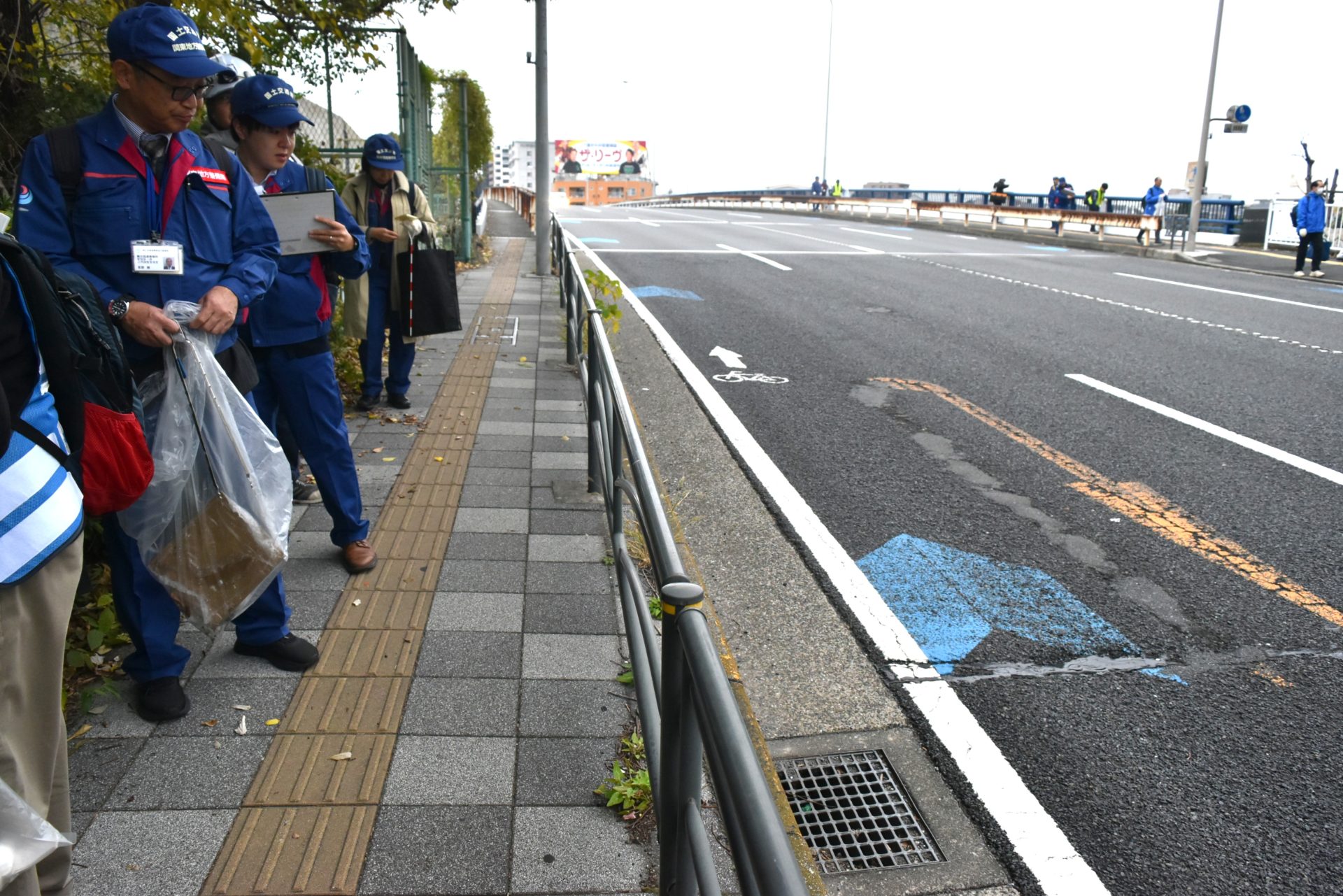 当日は、横浜国道事務所から7人、関東学連から3人、県建設業協会から14人が参加した。参加者は市場富士見町の市場公園で出発式を行った後、ゴミを拾いながら、舗装面の破損箇所などを細かくチェック。観客の視界を妨げたりランナーへ干渉したりする恐れのある枝の確認も行い、ランナーはもちろん、観客も含めた沿道の安全面についても目を配った。