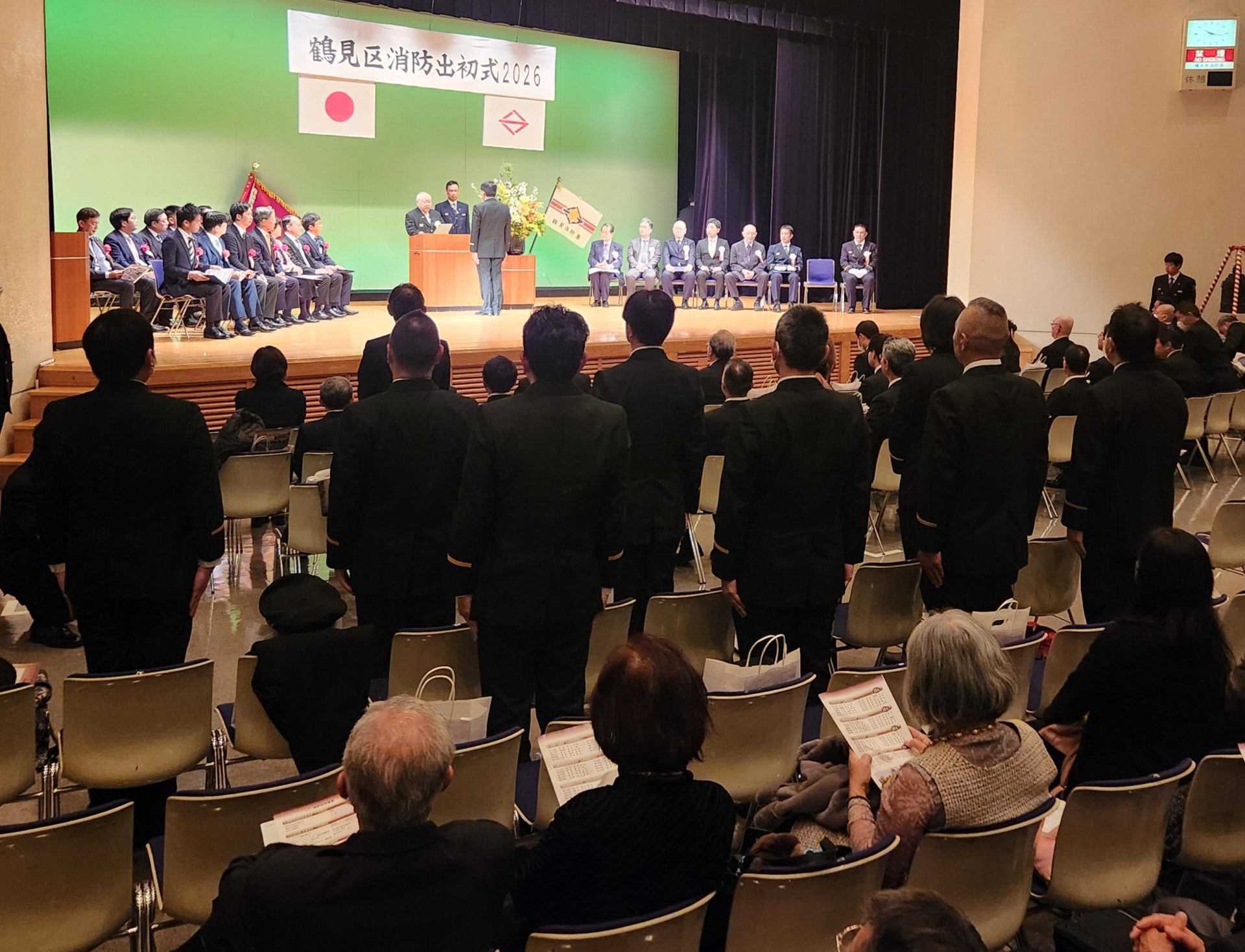 鶴見公会堂では、鶴見消防署、消防団などによる式典や演技が行われ、長年にわたり消防団活動に従事した団員や消防功労のあった個人、企業などへの表彰もあった(表彰者は以下で紹介)。