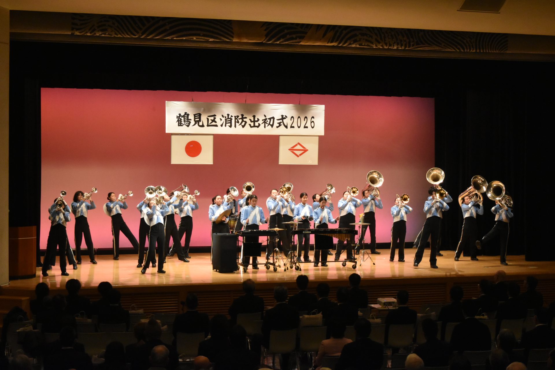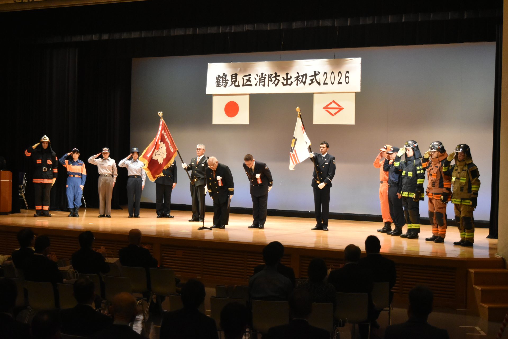 「鶴見区消防出初式2026」が1月10日、鶴見公会堂や鶴見駅東西の広場などで行われ、消防関係者らが一年の防火・防災を誓い合った。