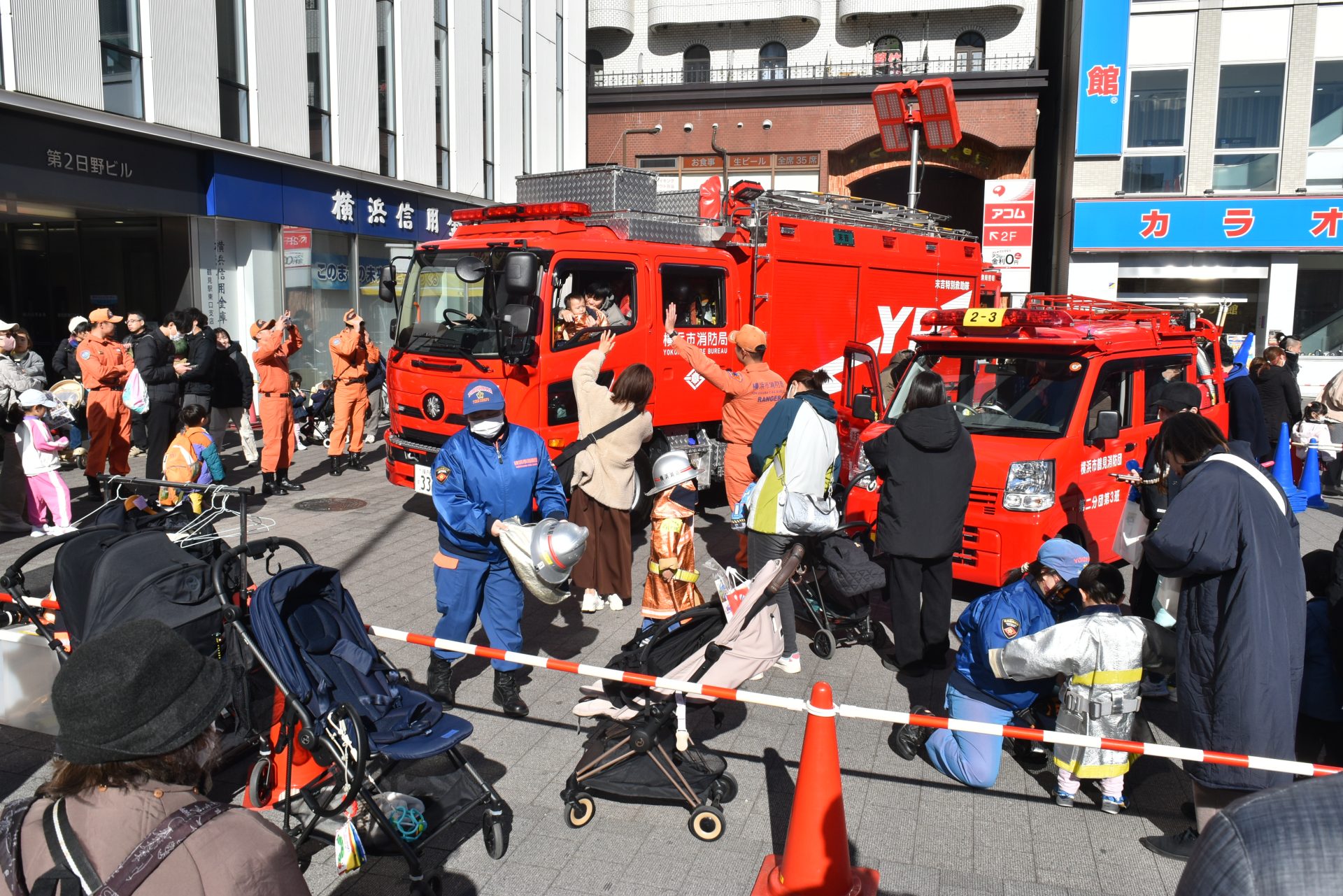 また、鶴見駅東口と西口の駅前広場を会場に、消防車や起震車を展示などふれあい企画がもあり、親子連れなどが消防体験を楽しむ姿が見られた。