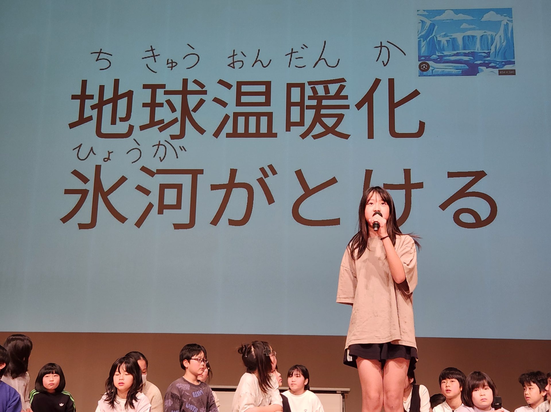 発表では、区内のごみ処理場を見学し、ごみが増えている現状から、地球温暖化につながっていることなどを学んだとして、「3R」の大切さを訴えた。