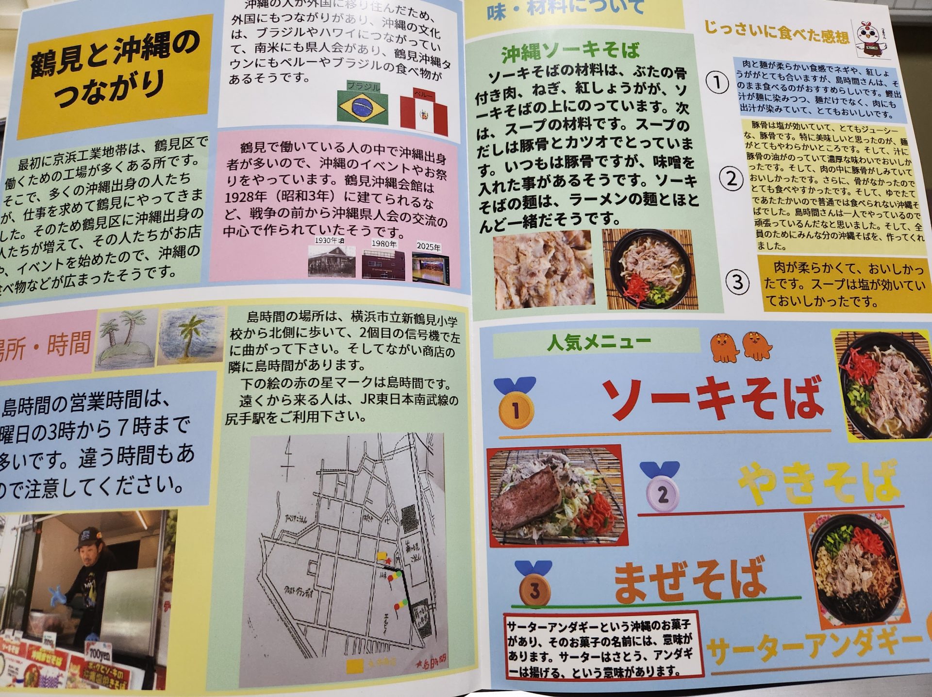 沖縄ルーツの人が多い歴史的背景などを横浜鶴見沖縄県人会に学び、学区内にある商店の軒先で出店している沖縄のキッチンカー「島時間」の紹介パンフレットを作成するなど、テーマにそった学習を深めてきた。