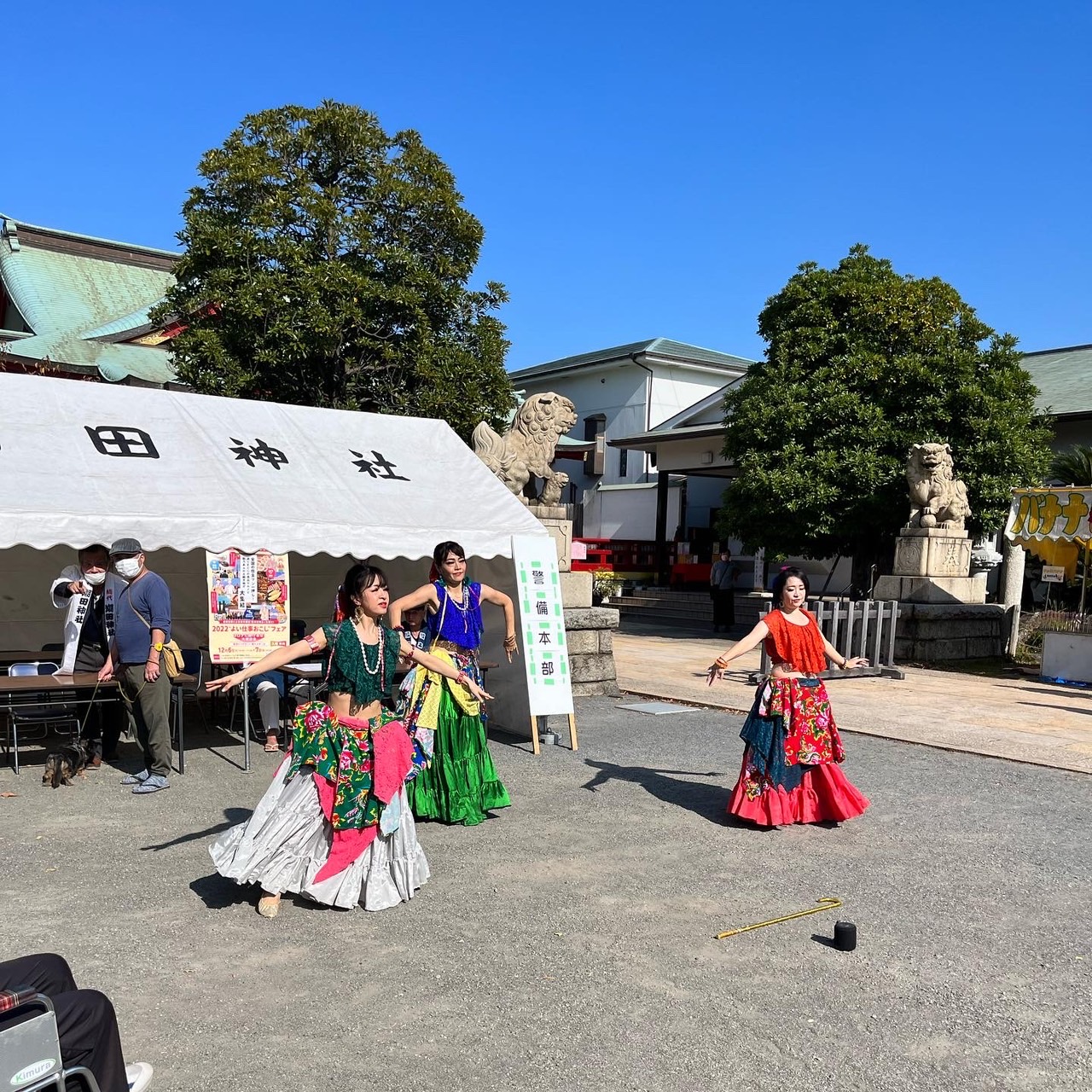 また、境内では両日、ベリーダンスやエイサーといったショーが披露され、水飴付きの紙芝居もあったほか、潮田囃子保存会による獅子舞の演舞などもあった。