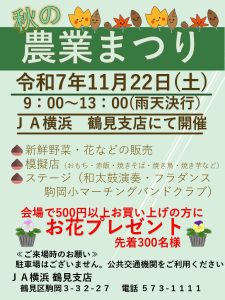 時間=9時~13時/会場=JA横浜鶴見支店/内容=地場産野菜販売や模擬店、ステージ等/入場無料/雨天決行/関連記事(こちら)