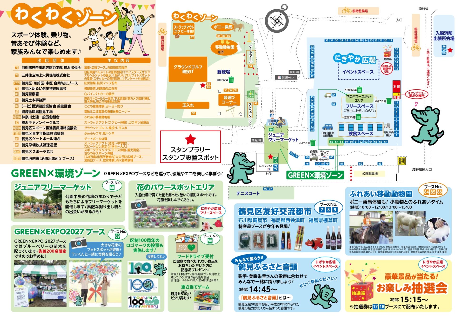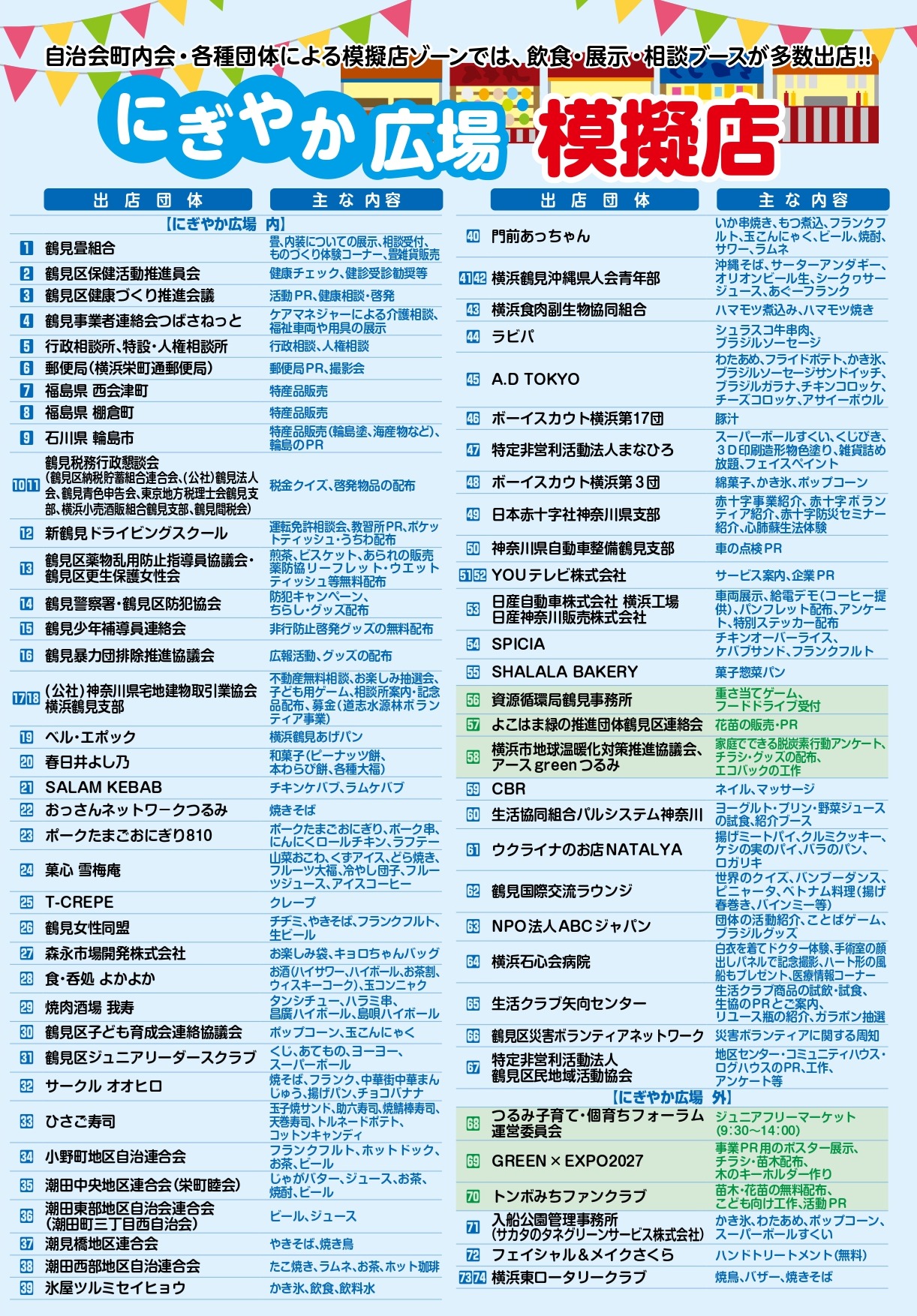 模擬店は鶴見区内で活動する各種団体によるPRブースをはじめ、飲食は自治会・町内会の出店や、近隣店舗などが鶴見グルメを販売するほか、鶴見区友好交流都市の石川県輪島市、福島県西会津町、同棚倉町による物産品ブースもある。
