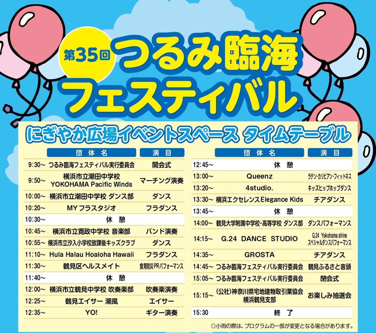 入場無料。小雨決行(一部プログラム変更の可能性あり)・荒天中止。公園駐車場は利用不可。問い合わせは、つるみ臨海フェスティバル実行委員会事務局(鶴見区役所地域振興課内)045−510−1687。詳細は鶴見区ホームページ(こちら)