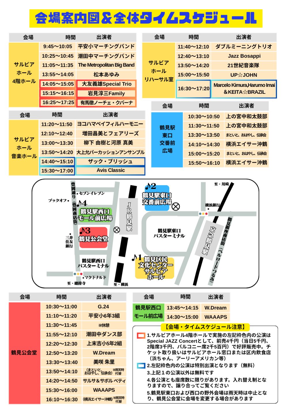 当日会場となるのは、東口側の鶴見区民文化センターサルビアホール4階ホール、同3階の音楽ホールとリハーサル室、東口交番前広場、西口側は鶴見公会堂と、同日開催のイベント会場となっている鶴見駅西口モール前広場の6カ所。