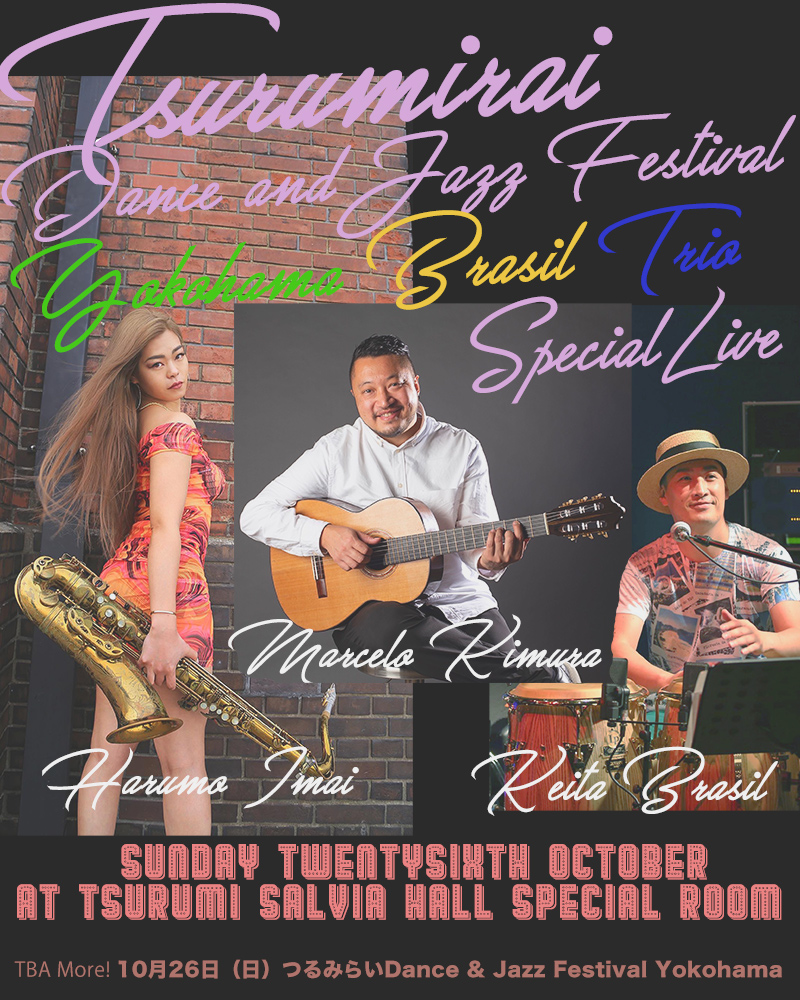 リハーサル室には、サンパウロ出身のギタリストで、サックスのレジェンド・渡辺貞夫さんのツアーメンバーとしても活躍するマルセロ木村氏、ジャズを中心に幅広いプレイで有名ミュージシャンとも共演するサックスプレイヤー・Harumo Imai氏、欧米各地で実績のある打楽器奏者・KTa☆brasil(ケイタブラジル)氏によるイベント限りのスペシャルトリオが出演。
