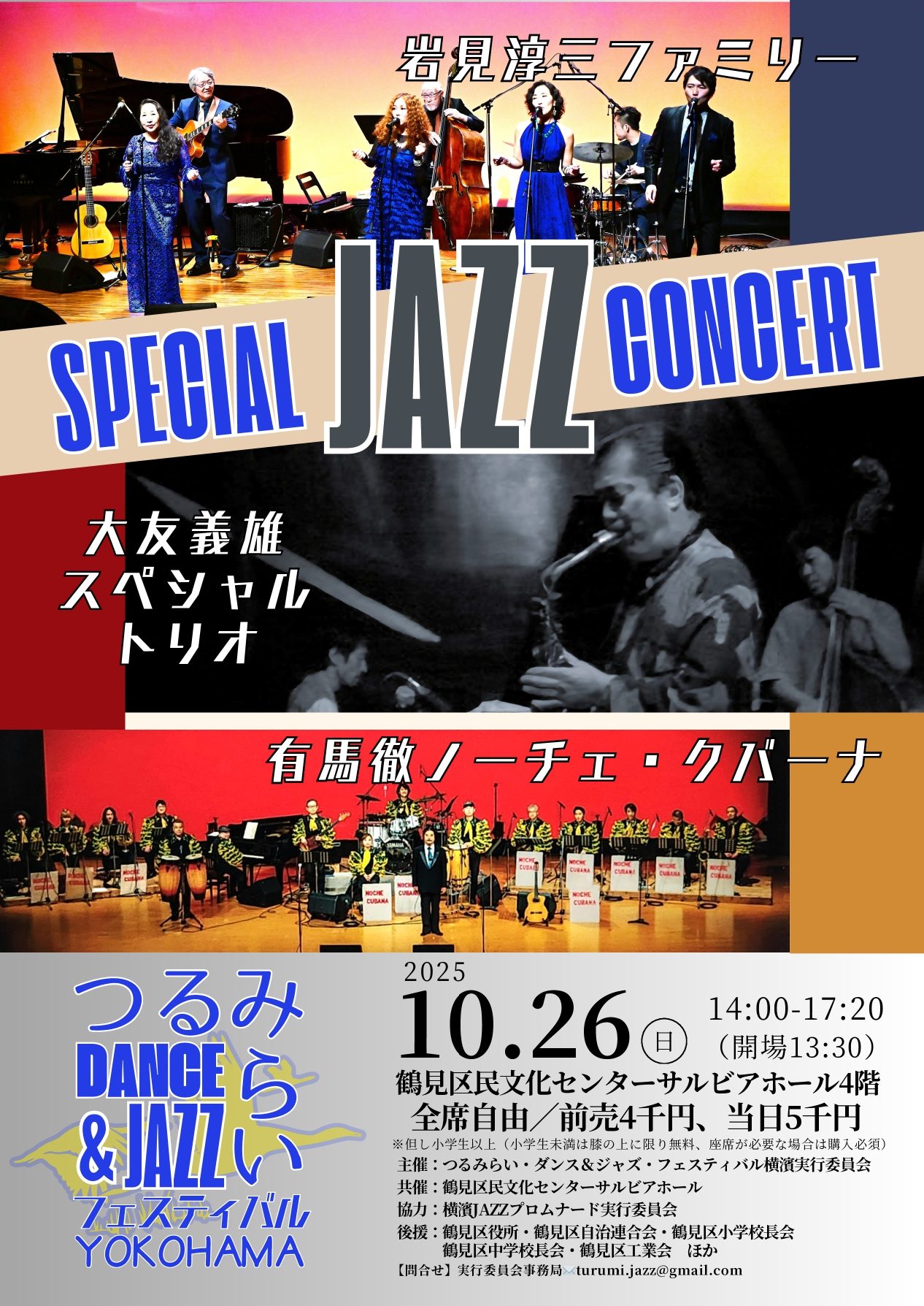 雨天時、野外会場となる東口交番前広場は鶴見公会堂で代替出演(上の宮中学校和太鼓部のみ中止)、鶴見駅西口モール前広場は中止となる予定(西口の広場では別イベント「鶴見駅西口オープンカフェ」との連携ステージ)。問い合わせは、つるみらいDance&JAZZ実行委員会メールturumi.jazz@gmail.com。出演者とタイムスケジュールは以下の通り。