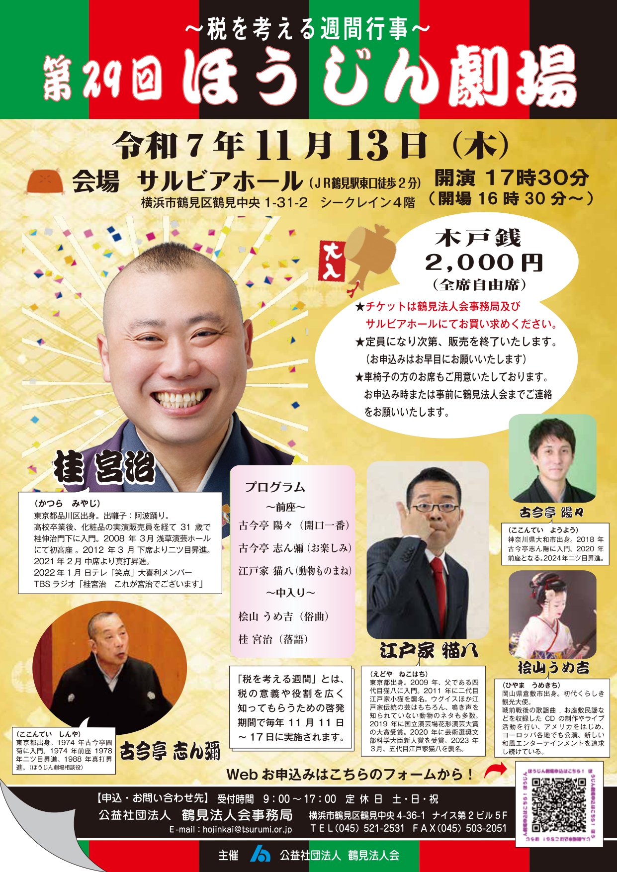 ほうじん劇場は、毎年11月11日から17日の「税を考える週間」に合わせて鶴見法人会が実施している寄席イベント。