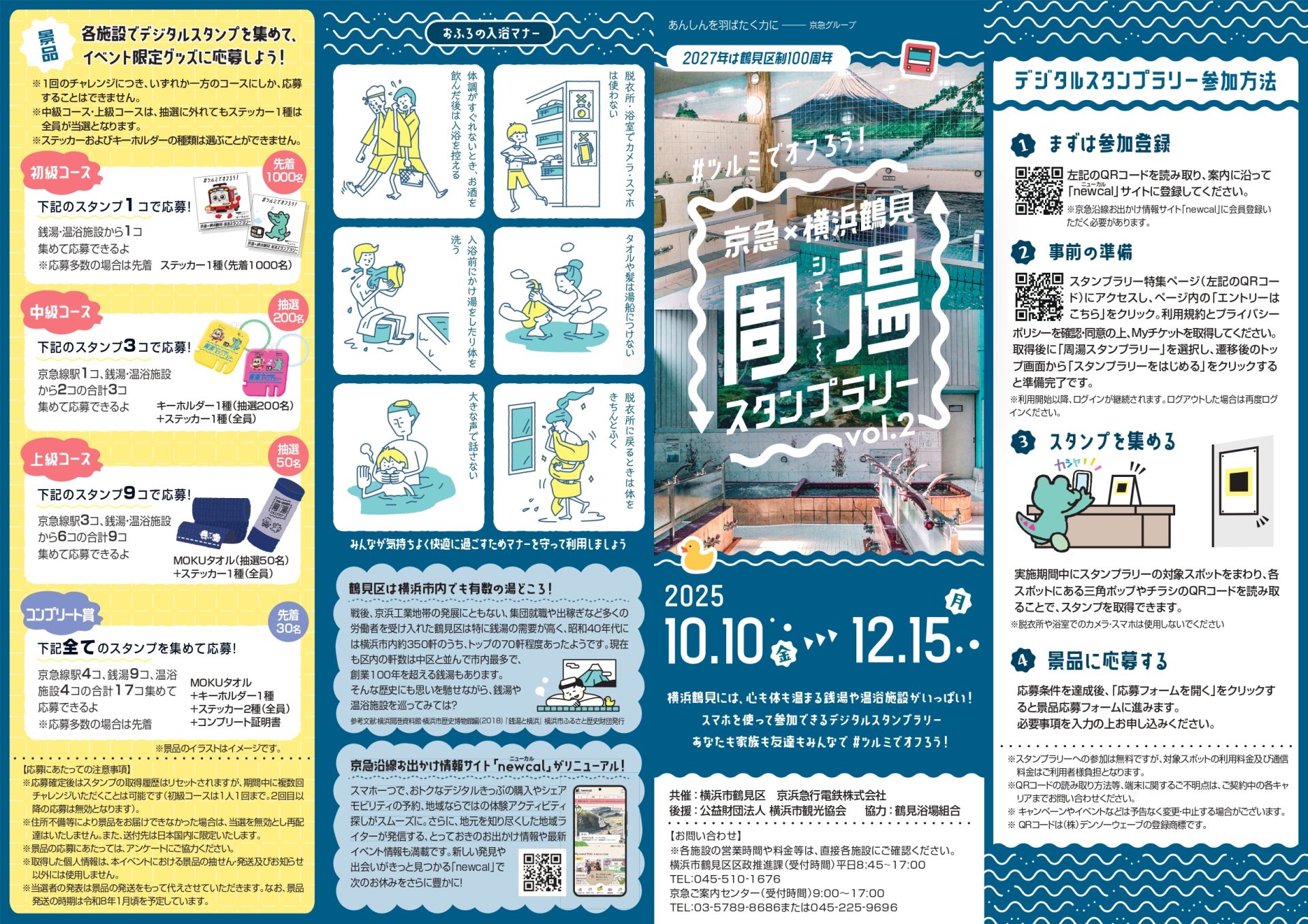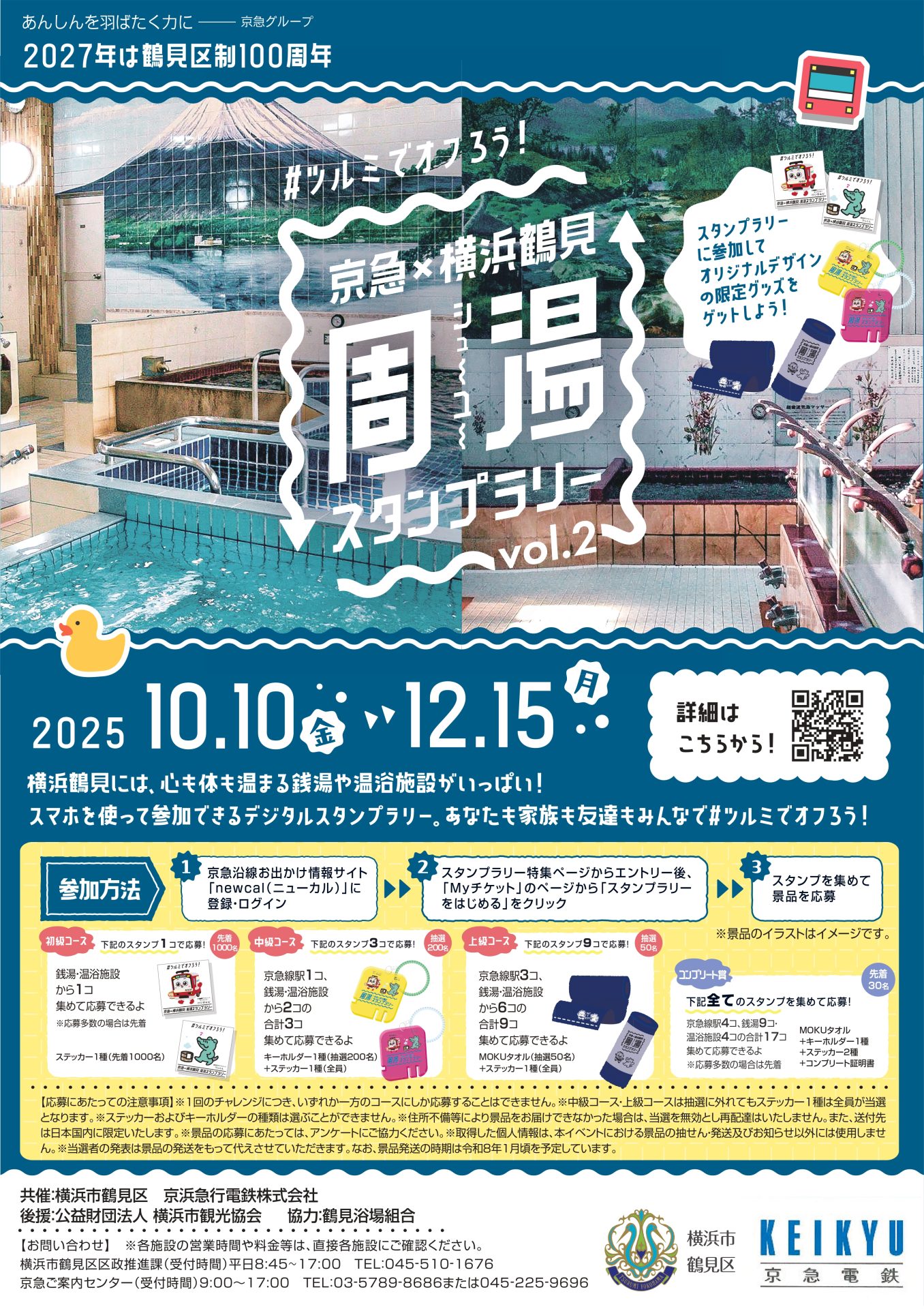 周湯スタンプラリーは、誘客促進について協定を結ぶ鶴見区と京急電鉄㈱による共催企画。昨年度に続く2回目の開催で、(公財)横浜市観光協会が後援し、鶴見浴場組合が協力する。