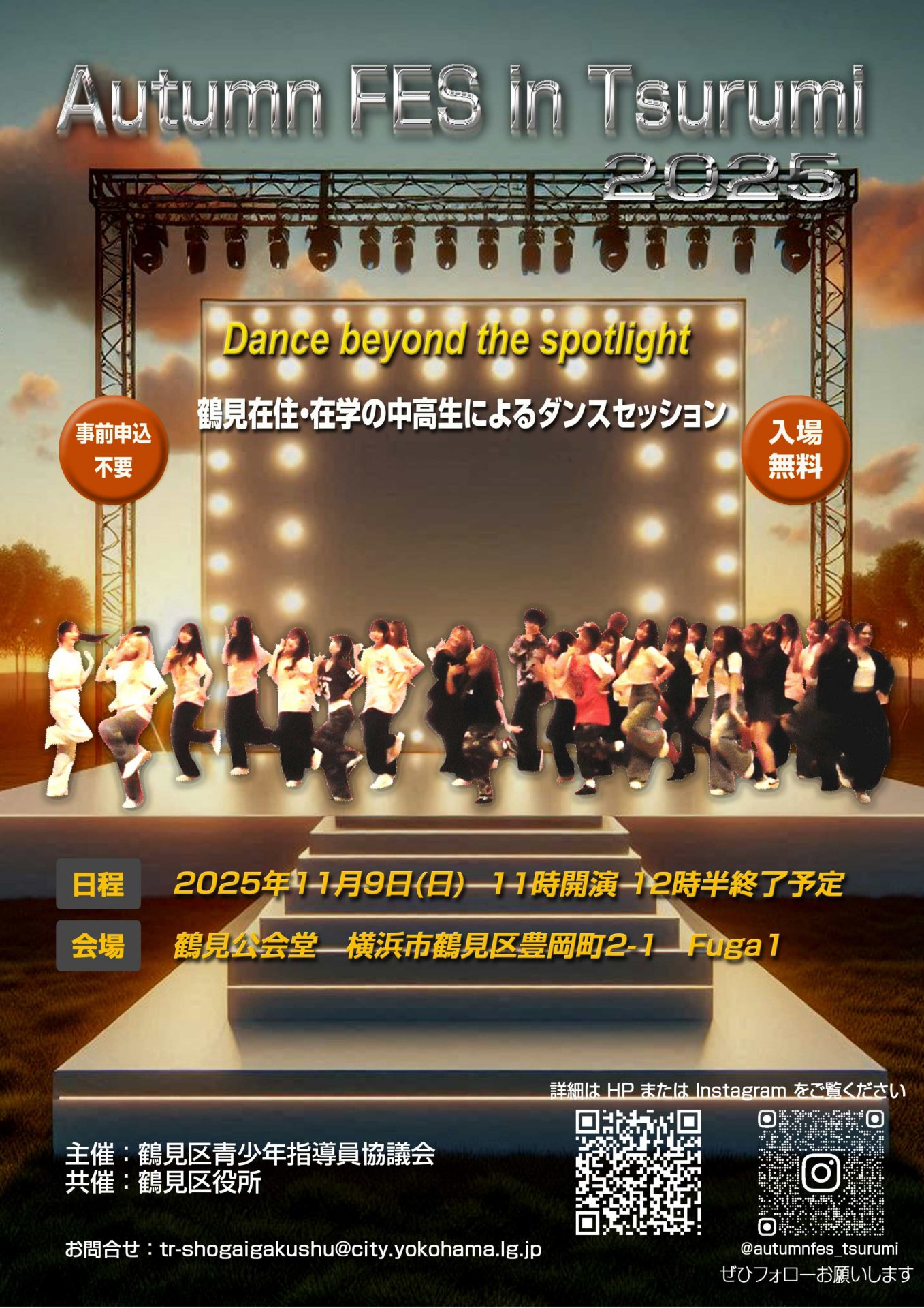 鶴見区内在住・在学中の中高生ダンサーらによるダンスイベント「Autumn FES in Tsurumi 2025」(オータムフェスinつるみ)が、11月9日㈰11時~13時過ぎごろまで、JR鶴見駅西口すぐの鶴見公会堂=鶴見区豊岡町2-1フーガ1=で行われる。