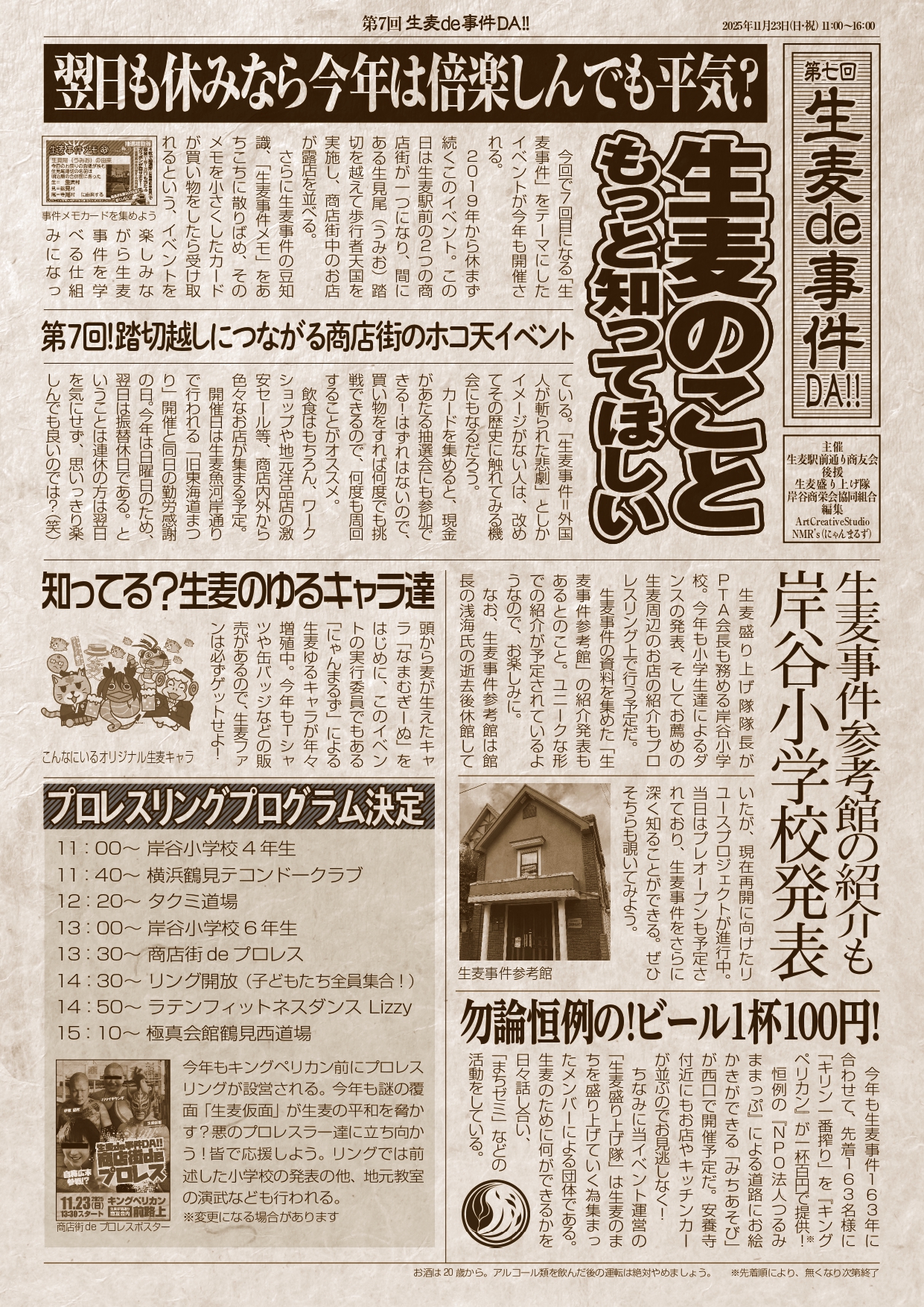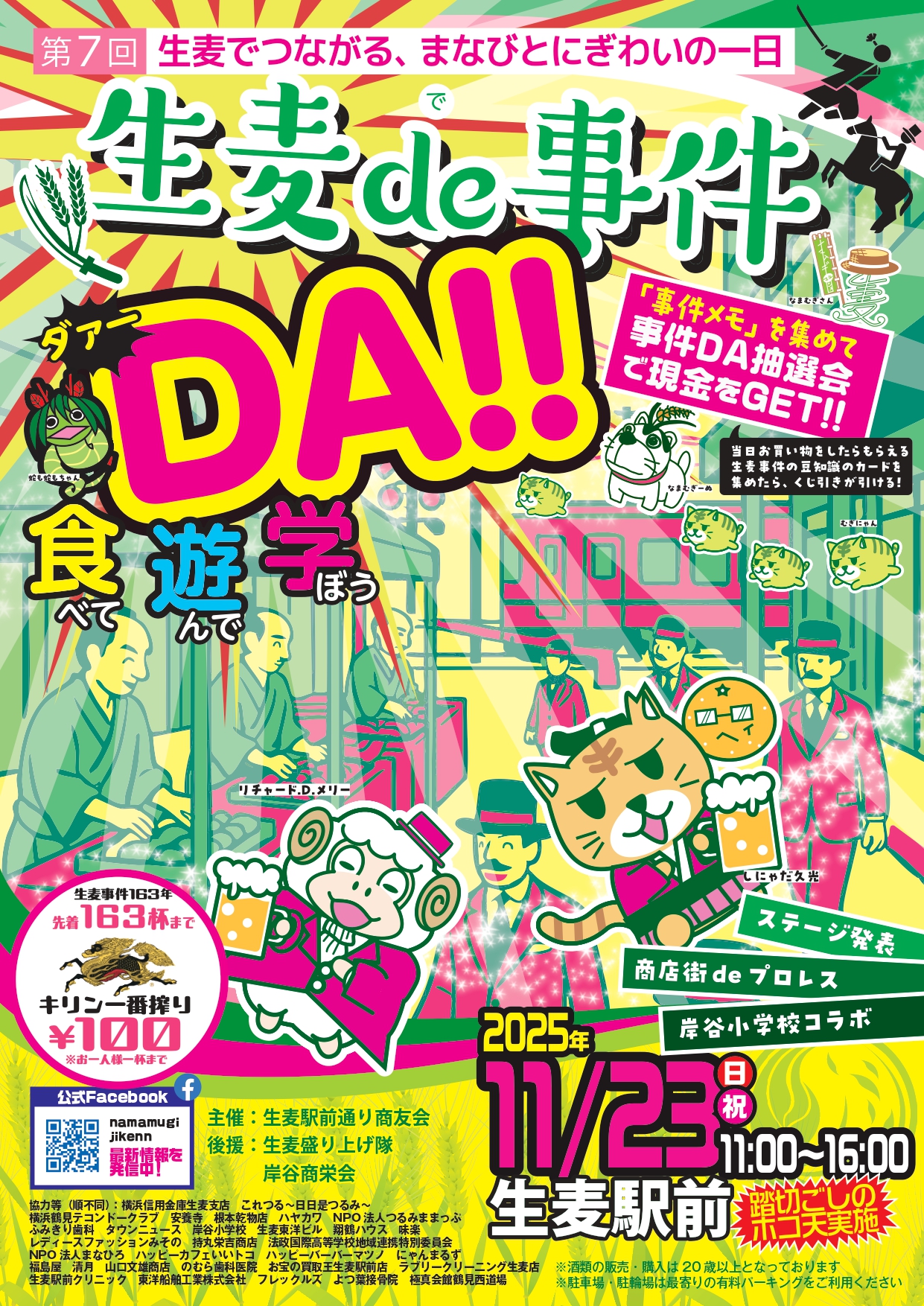 京急生麦駅の東西を結ぶ地域イベント「生麦de事件DA‼」が、11月23日(日・祝)11時~16時まで開かれる。主催は生麦駅前通り商友会。生麦や岸谷周辺の商店主などから成る団体「生麦盛り上げ隊」と岸谷商栄会が後援する。