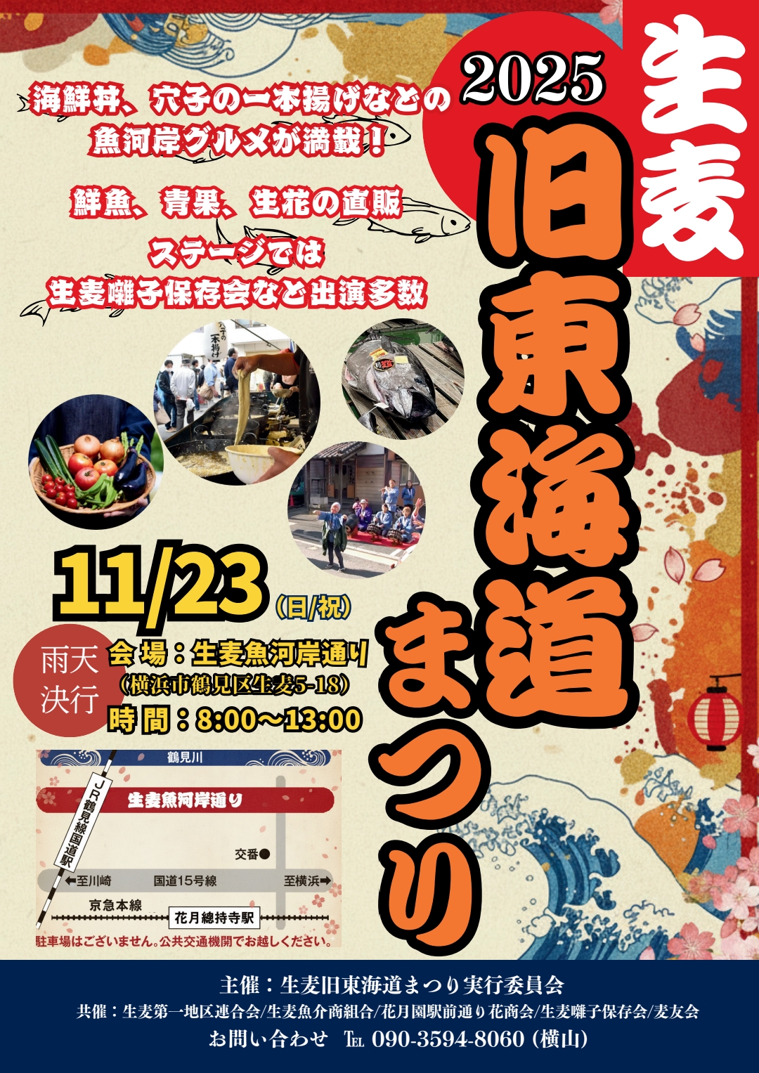 JR鶴見線「国道」駅すぐの旧東海道沿い、生麦魚河岸通りで11月23日㈰朝8時~13時まで、恒例イベント「生麦旧東海道まつり」が開かれる。主催は生麦旧東海道まつり実行委員会。生麦第一地区連合会、生麦魚介商組合、花月園駅前通り花商会、生麦囃子保存会、麦友会が共催。