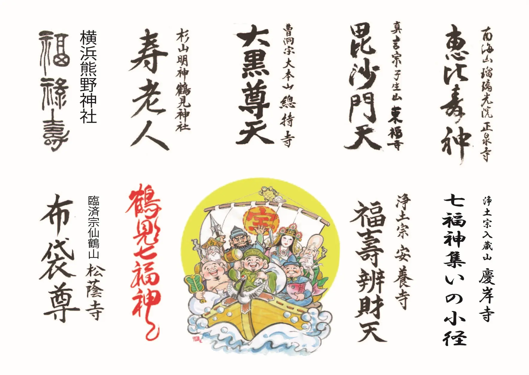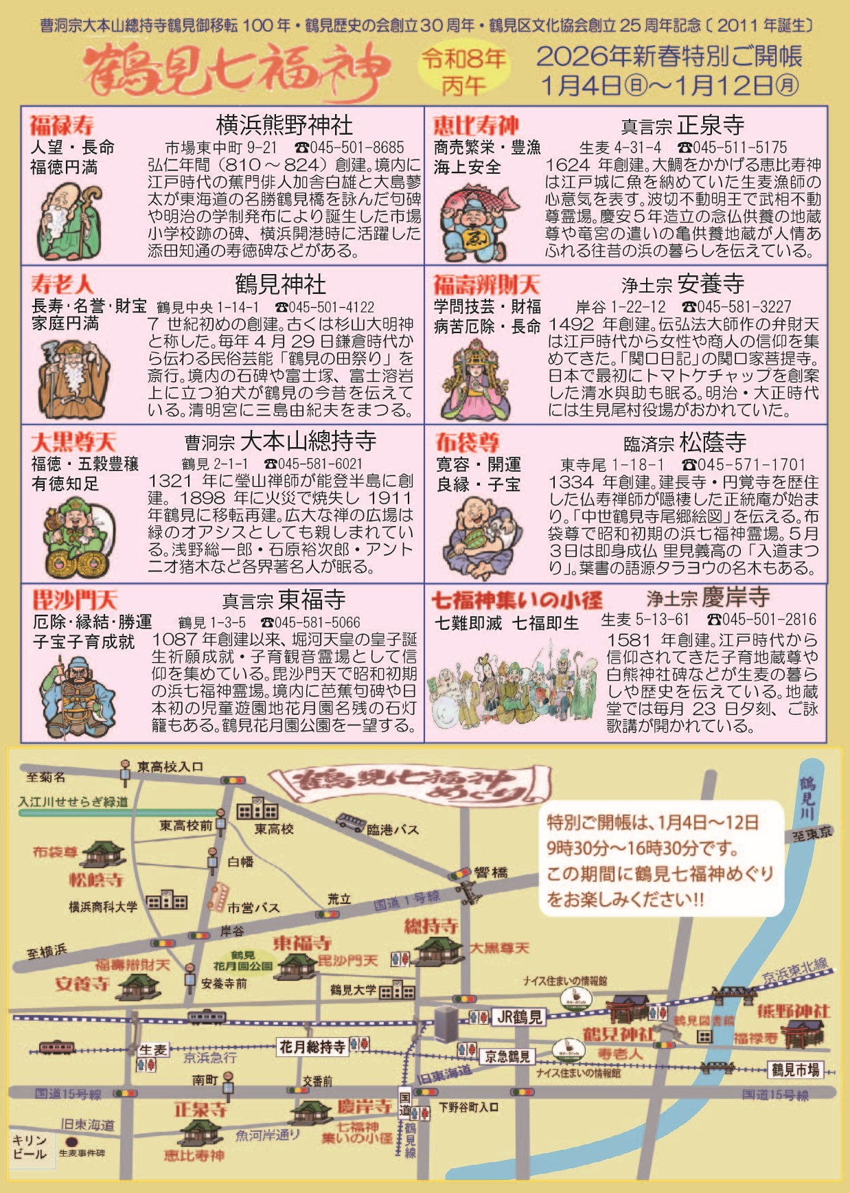 七福神がまつられているのは、横浜熊野神社=市場東中町=(福禄寿)、鶴見神社=鶴見中央=(寿老人)、大本山總持寺=鶴見=大黒尊天、東福寺=鶴見=(毘沙門天)、正泉寺=生麦=(恵比寿神)、安養寺=岸谷=(福壽辨財天)、松蔭寺=東寺尾=(布袋尊)の7寺社。