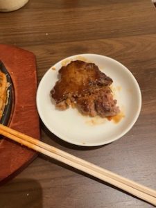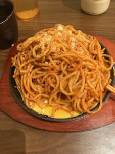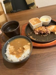 今回は、クリームコロッケとのセットでしたが、前回は焼きナポリタンとミニハンバーグのセットでした。こちらのメニューも捨てがたいのですが、今回終わってしまったとのことで残念でした。お店の人に、復活をお願いしたところ、検討してくれそうな気配でした。そして、何よりも本来のハンバーグ料理を様々なソースで試してみたいという誘惑にかられました。近日、再訪問を予定しています。(写真の焼きナポリタンには、上にミニハンバーグがありました。我慢できずに少し食べてしまいました。)