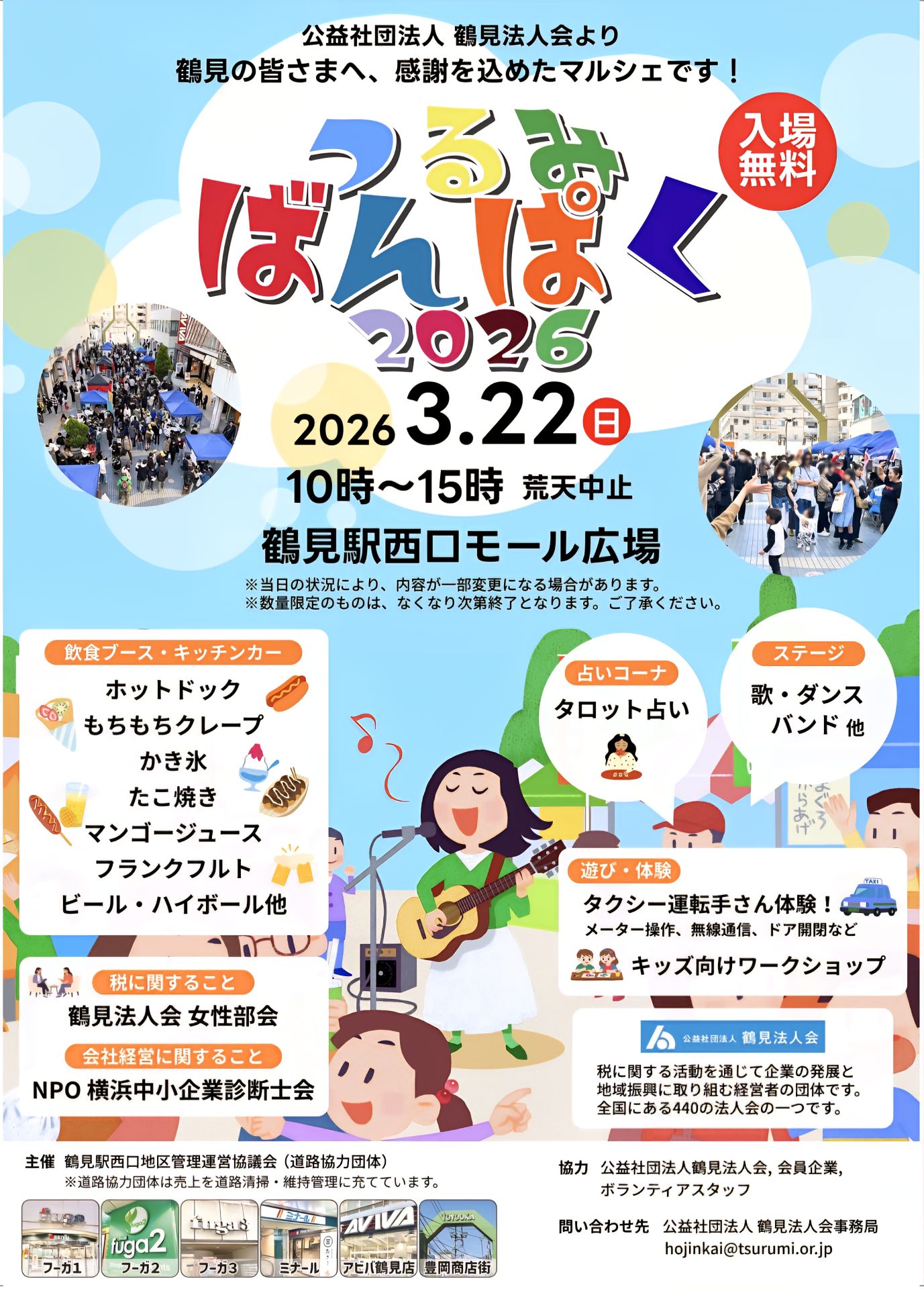 (公社)鶴見法人会が3月22日㈰、地域への感謝を込めたマルシェイベント「つるみばんぱ2026」を鶴見駅西口モール前広場で開催する。時間は10時~15時まで。入場無料。荒天中止。