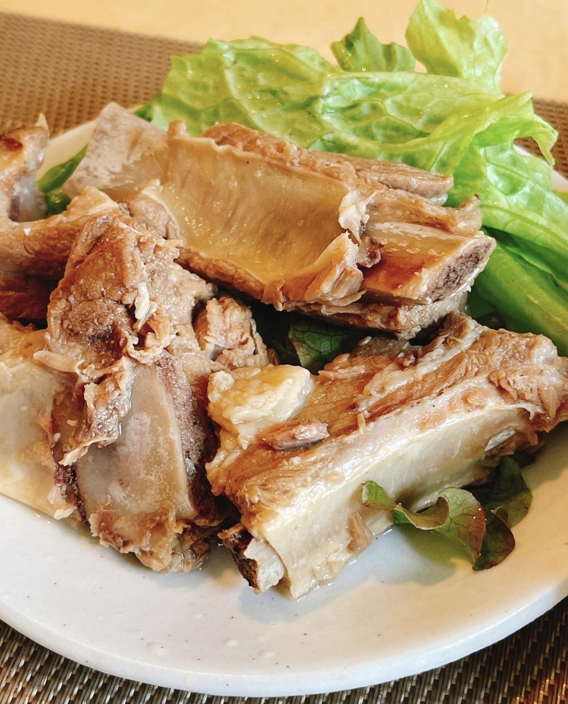 黒豆、豚肉、牛肉の塩漬けなどの煮込み料理。シンプルな塩味が食欲をそそり、ご飯が止まらなくなる美味しさ。