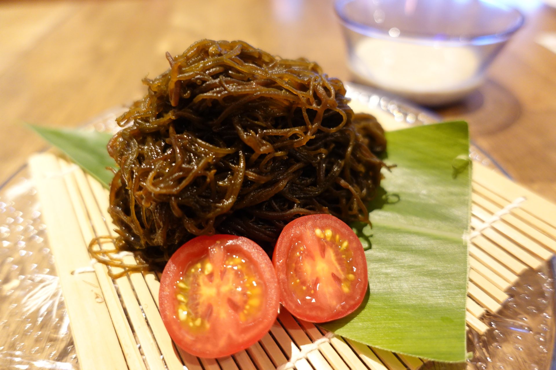 沖縄から直送のミネラルたっぷりの少しもちっとした食感のもずく。酢ではなく、ごまだれにつけ、そばのように食べるのがななまかい流。