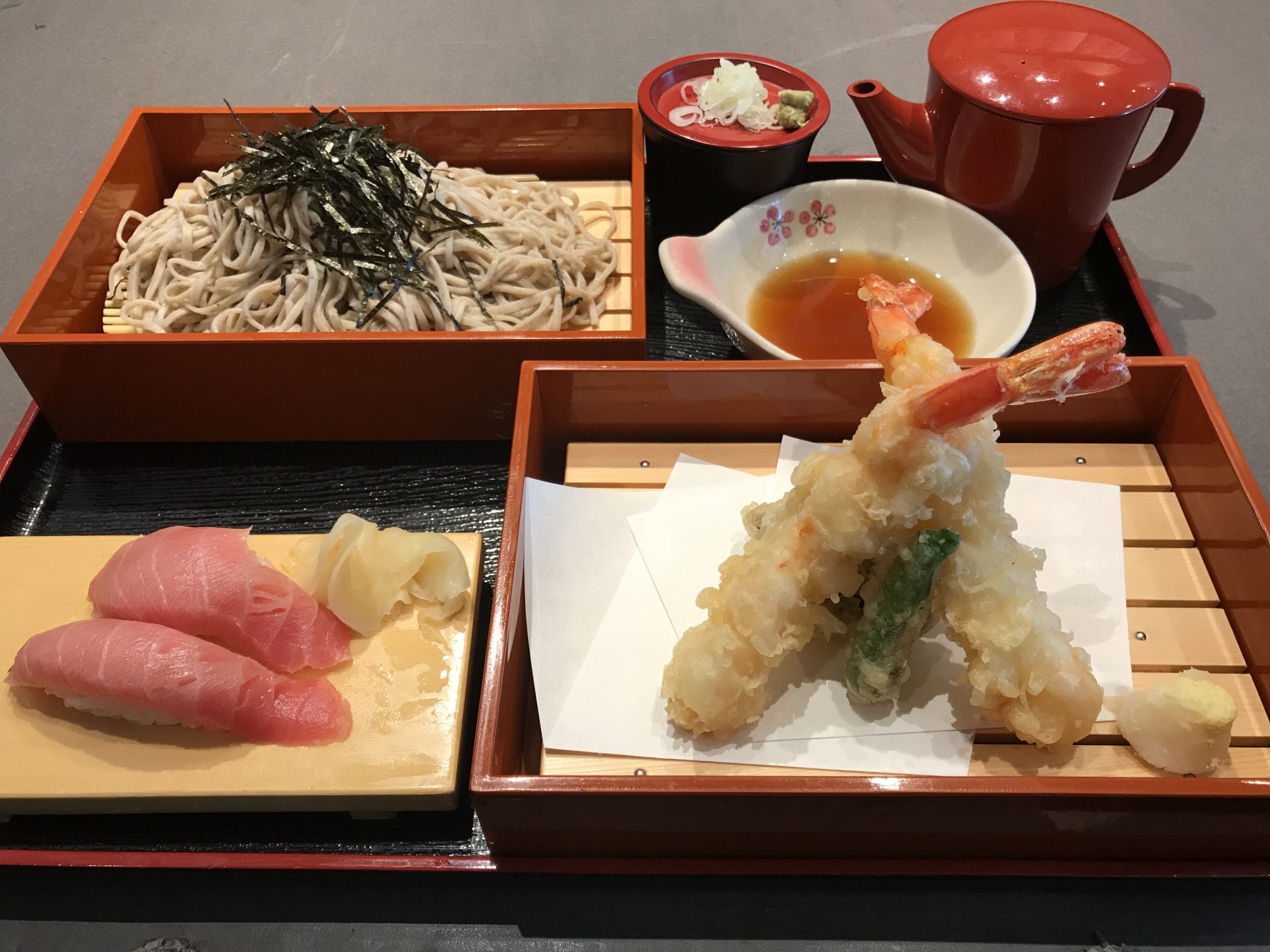 中トロ握り2貫と、コシのある北海道産そば粉使用のそばに天ぷらがつくボリューム。長く愛されているということが、人気の秘密かもしれない。