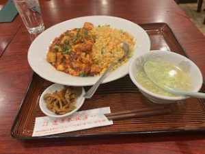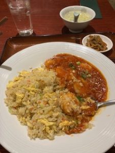 その中で、各店舗はどのように差別化を図るかで腐心してる様子です。今回この店に注目したのは、メニューに、エビチリ炒飯とマーボー炒飯があるということなのです。今から40年ほど前ですが、家の近くにあった町中華で、「マーボー炒飯」が提供されていました。これが、当時珍しく、大変おいしかった記憶があります。そこで、職場の近くの中華屋さんに、「マーボー炒飯」は作れないかと聞いたところ、味が甘くなってよくないと断られました。それ以来、沙汰止みになっていましたが、この店で、マーボー炒飯のメニューを見たとき大変うれしく思いました。さらに、びっくりしたことに、エビチリ炒飯もあることでした。