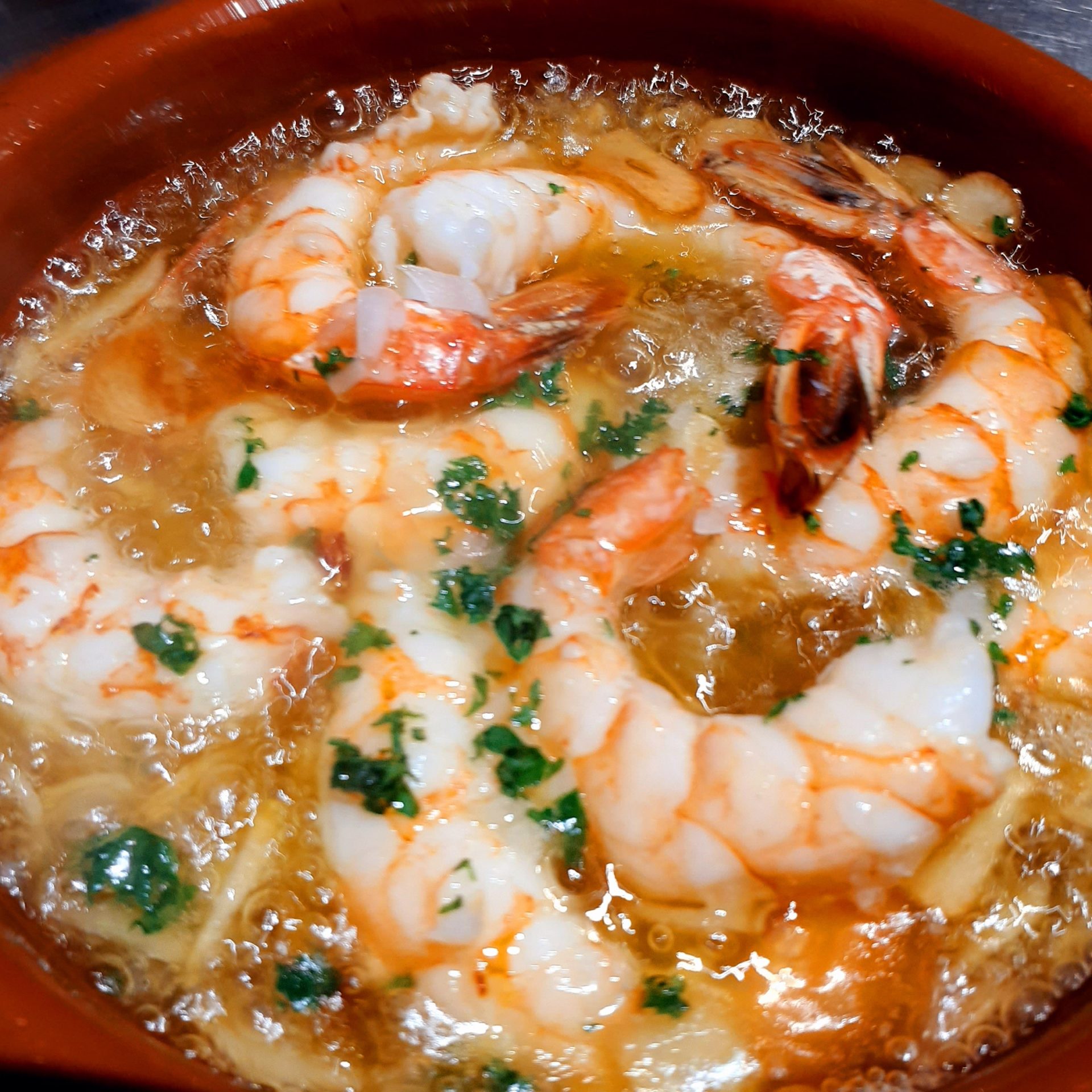 - 低温で煮出した特製ガーリックオイルが美味しい海老のアヒージョ
