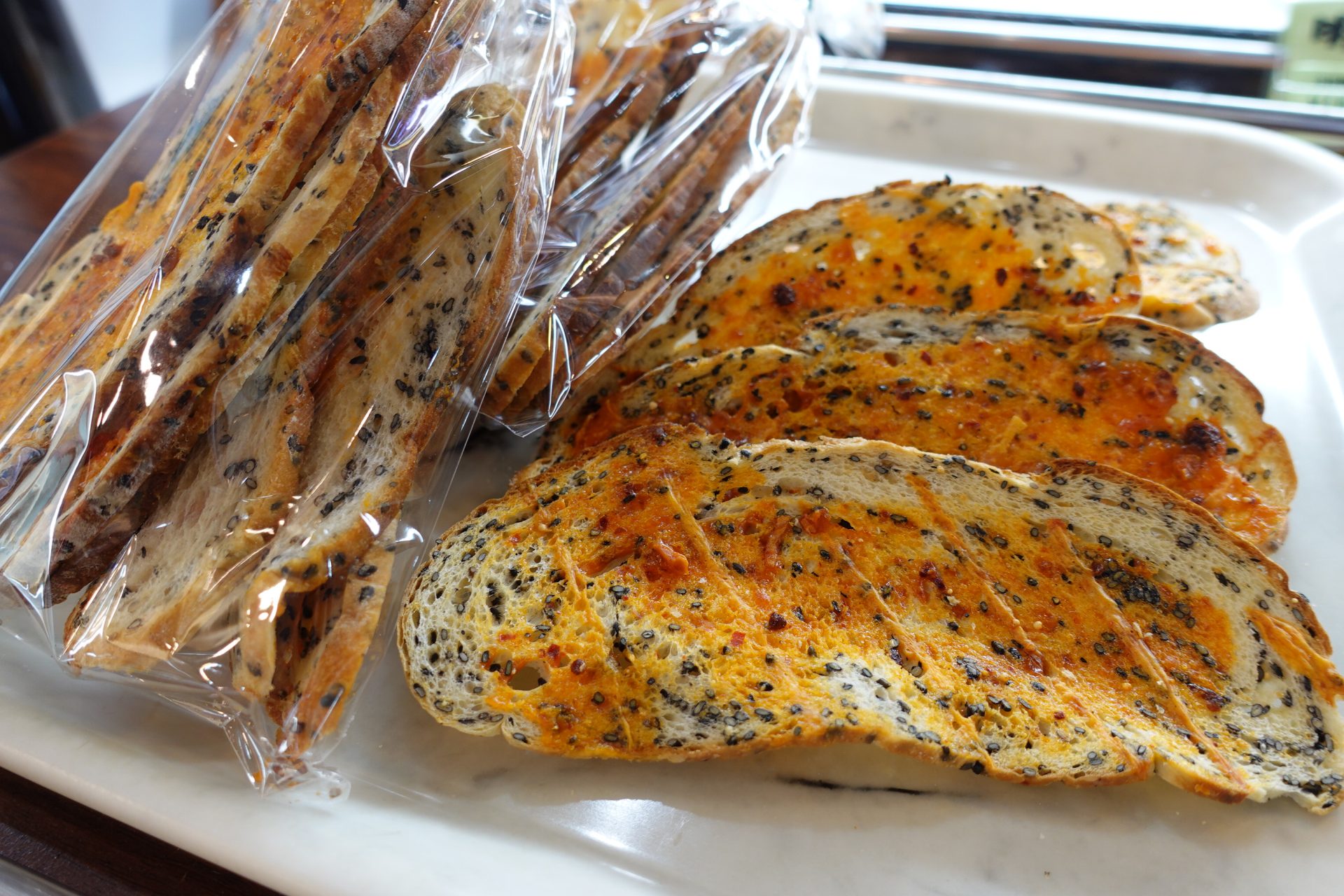ごまフランスパンに、にんにく、ラー油マヨ、チェダーチーズを塗り、低温でカリカリに焼いた商品。香り濃厚、おつまみにも抜群というスナック的なパンだが、実は、ごまフランスパンが余ったときにしかお目見えしないとか。見つけたら買って損なしのパンだ。