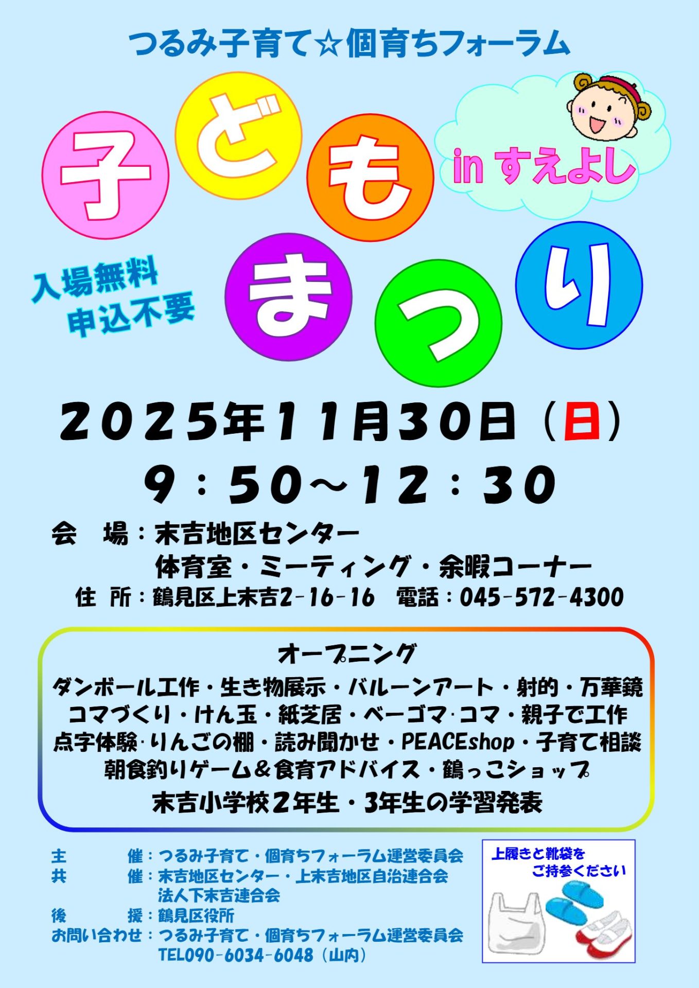 末吉地区センター=鶴見区上末吉2-16-16=で11月30日㈰9時50分~12時30分まで、子ども向けイベント「子どもまつりinすえよし」が開催される。