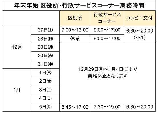 区役所窓口は、年末27日㈯は土曜開庁のため午前のみ開庁するが、4日までで年末年始は計8日間窓口が休止となるので注意が必要だ。
