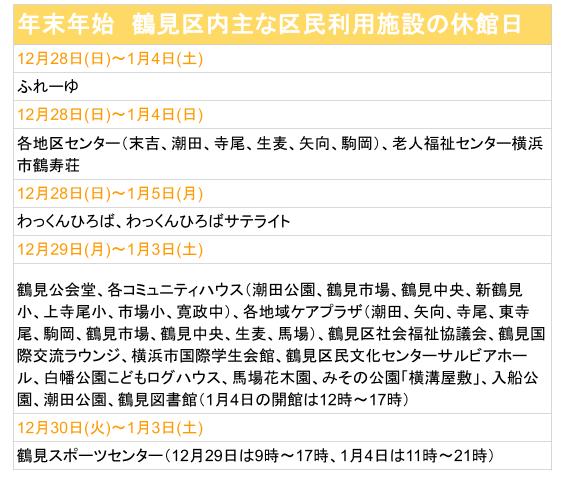 【2025−26年末年始お役立ち情報③】 鶴見区内の主な区民利用施設 年末年始の休館案内一覧