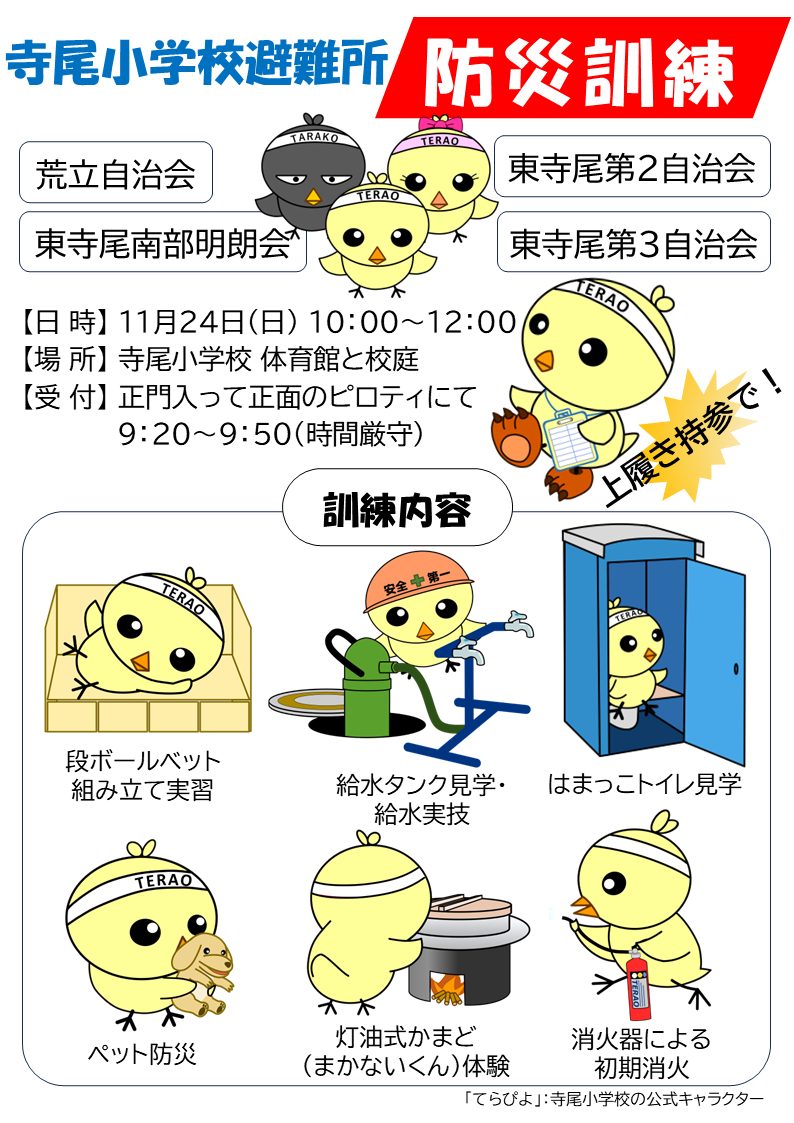 秋は鶴見区の様々な地域で、防災拠点訓練が実施されますが、横浜市立寺尾小学校の防災拠点の訓練も11月24日(日)に実施されます。9:20から9:50まで参加者の受付をして、10時から訓練を開始します。参加するのは、この防災拠点に属する東寺尾第二自治会・東寺尾第三自治会・東寺尾南部明朗会と荒立自治会、および横浜市東寺尾地域ケアプラザです。