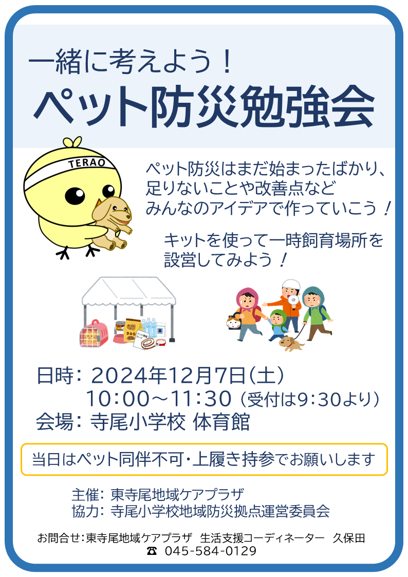 災害のときに避難所となる地域防災拠点で、ペットと一緒に避難してきた人々をどのように受け入れるか?この重要なテーマについて学ぶ勉強会を、寺尾小学校地域防災拠点(横浜市鶴見区東寺尾5-19-1)で12月7日(土) 10:00から開催します。