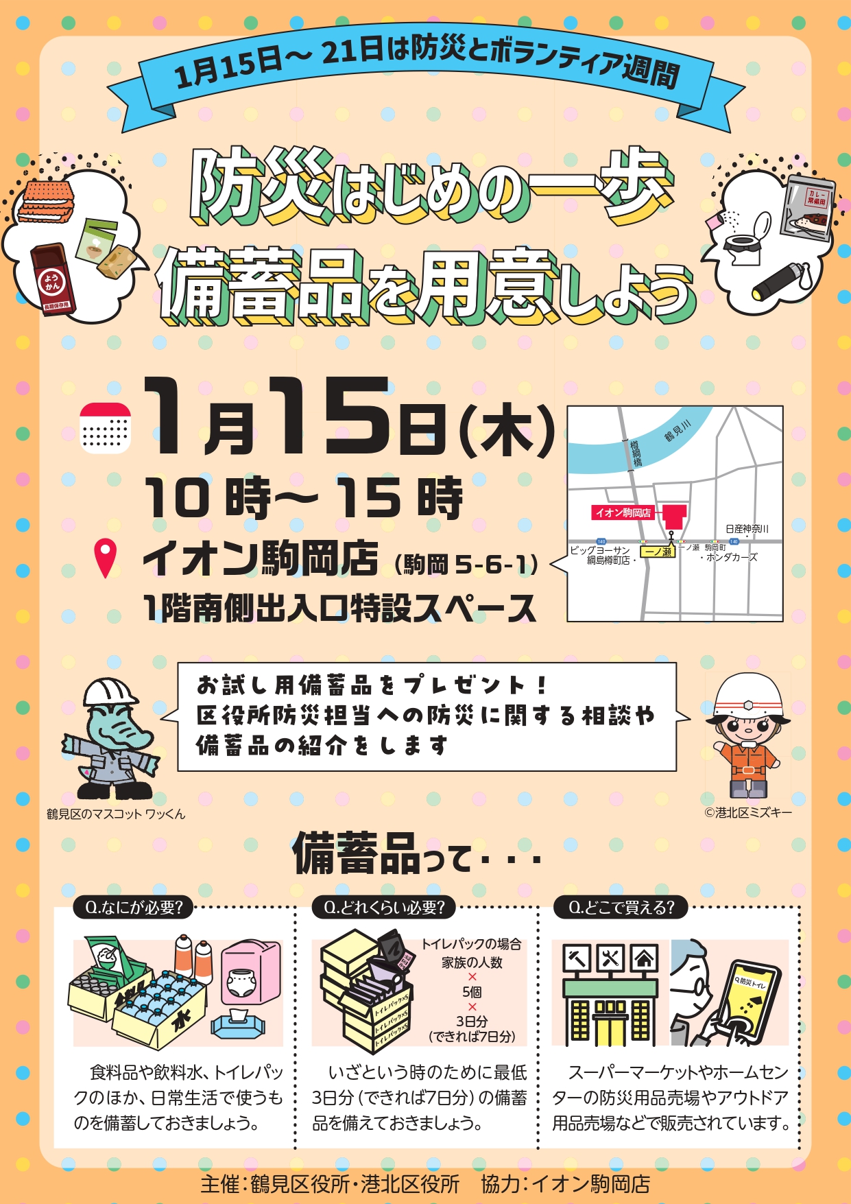 鶴見区役所と港北区役所はイオン駒岡店=鶴見区駒岡5-6-1=で1月15日㈭、防災啓発キャンペーンを実施する。時間は10時~15時。