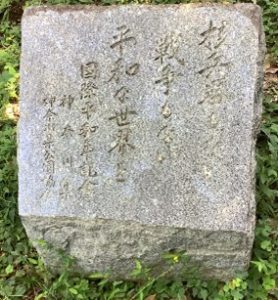 この石碑は、「核兵器もない、戦争もない、平和な世界を」と書いてありました。この石碑は昭和62年に作られたものだそうです。この石碑はパークセンターの近くの階段を登ったところにありました。ぜひ見つけてください。