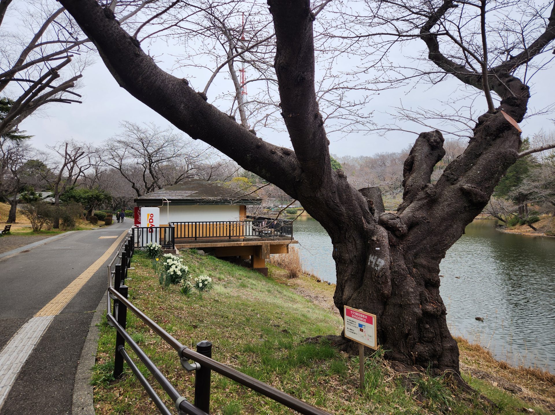 三ツ池のソメイヨシノは、この標準木が5輪咲いた時点で開花が宣言される。