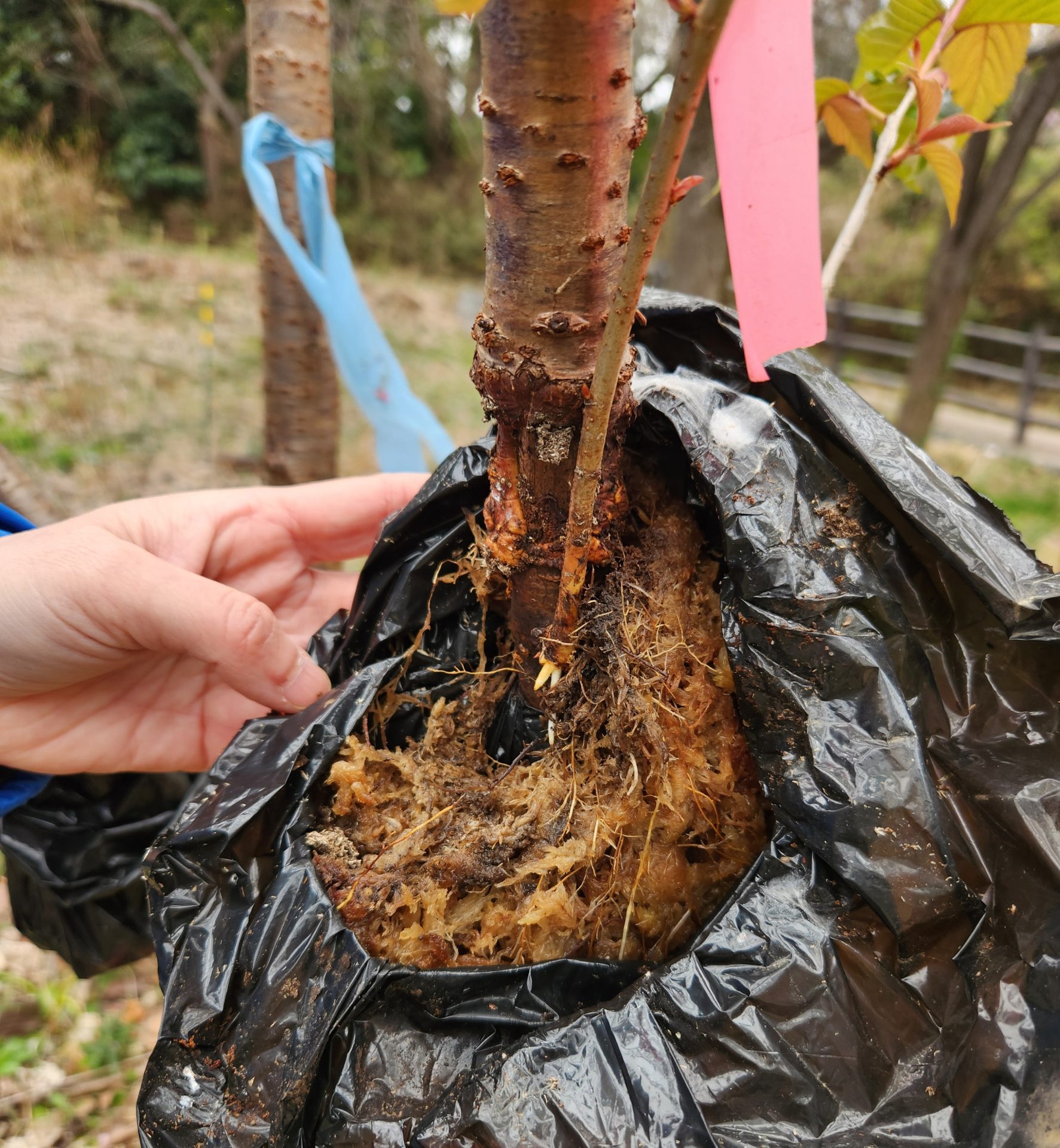 中央に見える小さな白い根っこが生きている証。伐採した椿寒桜を取り木という手法で再生する試みを続けている