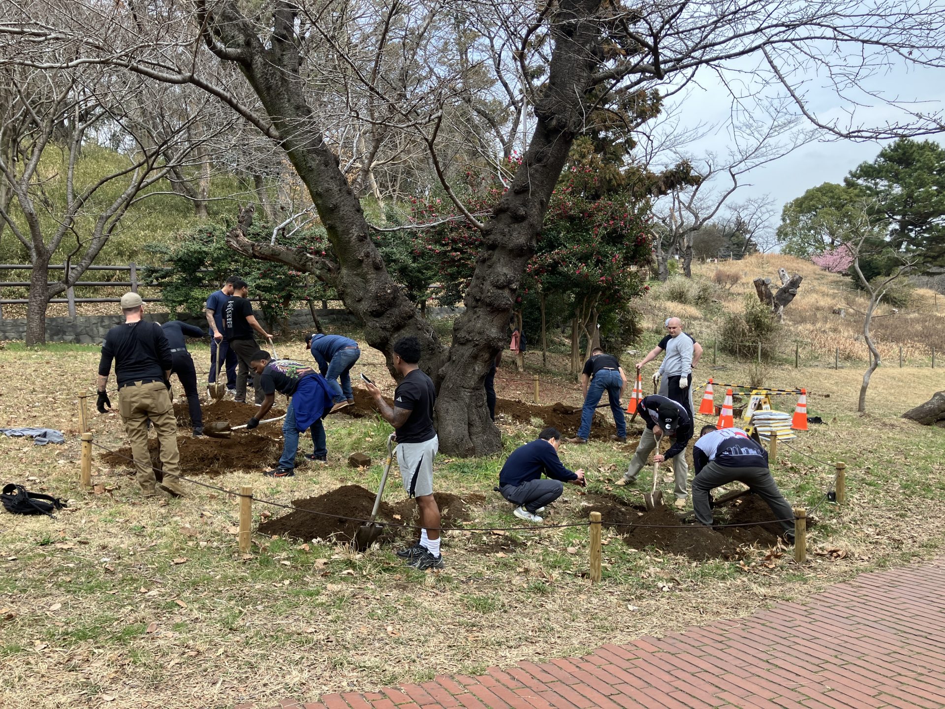 - 米軍の兵士たちが1m近く溝を掘り、桜の根を整備