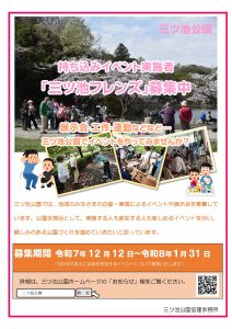 三ツ池公園では、地域のみなさまの企画・実施によるイベントや展示会を募集しています。公園を舞台として、実施する人も参加する人も楽しめるイベントを行い、親しみのある公園づくりを進めていきたいと思っています。 ************************************** « 【鶴見近郊 このお店】 鶴見線秘境駅の秘境飯 鶴見銀座商店街 「つるぎんドット来〜い」 2025年ラストの12月は1週早い20日㈯に「クリスマスライブとパレード」 »